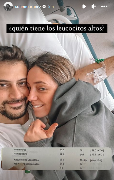 “¿Quién tiene los leucocitos altos?”, escribieron en una stories de Instagram donde se los veía en una cama acostados y abrazados. Además, se podía ver que el hijo de Alfredo Leuco llevaba una vía para suero en uno de sus brazos. En la misma imagen, publicó los resultados de los análisis de sangre, dejando en claro que el recuento de estos glóbulos blancos arrojó un valor por arriba del máximo.