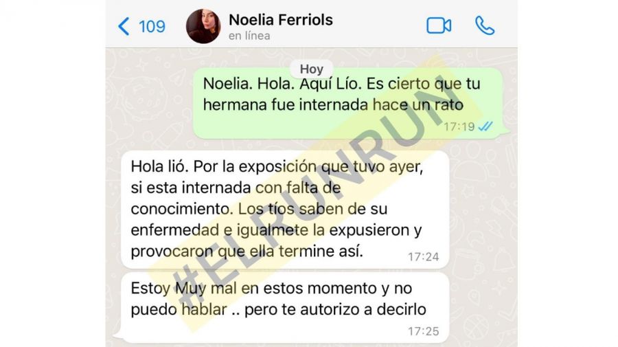 En su mensaje de WhatsApp, Noelia explica: "Por la exposición que tuvo ayer (A la Tarde), sí, está internada con ‘falta de de conocimiento’ (sic)". Y apuntó directamente contra sus tíos, el hermano de Beatriz y su esposa, a quienes Bettina comenzó a ver nuevamente después de haberles pedido ayuda: "Los tíos saben de su enfermedad e igualmente la expusieron y provocaron que ella termine así".