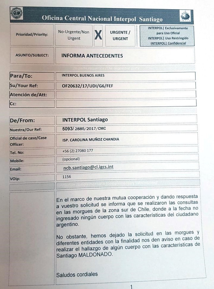 "No ha ingresado ningún cuerpo con las características del ciudadano argentino". La negativa pertenece a la Oficina Central Nacional de Interpol en Chile y fue enviada esta mañana a la sede de Interpol de Argentina, ante la consulta y distintas versiones que comenzaron a circular anoche respecto a la posibilidad de que Santiago Maldonado había aparecido sin vida en Chile.