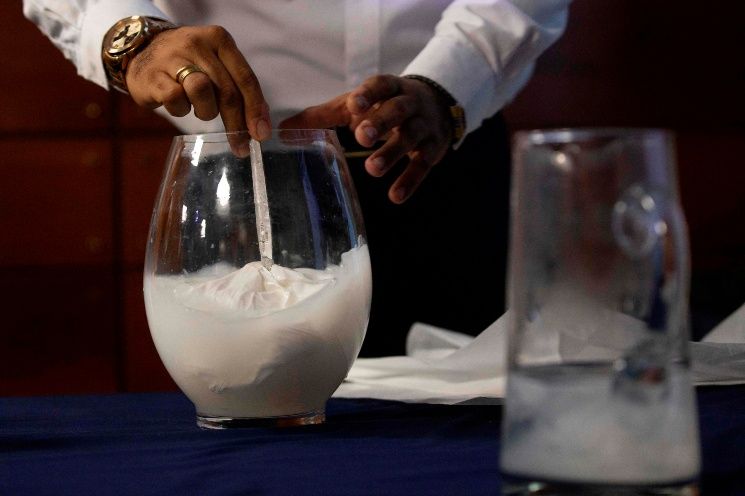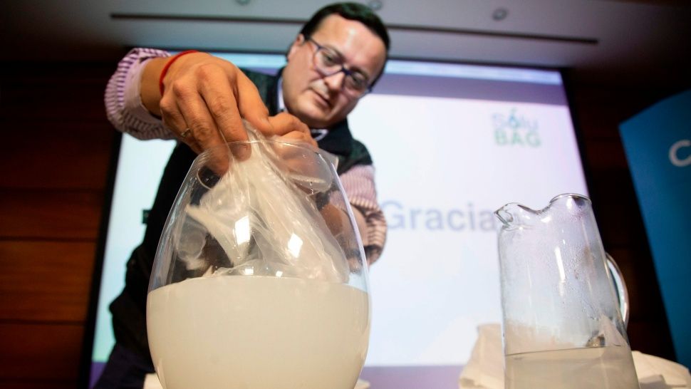 Ante la prensa, los dos muestran la solubilidad inmediata de sus bolsas plásticas en agua fría o de las bolsas de tela reutilizables en agua caliente. “Lo que queda en el agua es carbono”, asegura Astete, lo que las pruebas médicas realizadas han demostrado que “no tiene ningún efecto en el cuerpo humano”. Y para demostrar que el agua turbia que queda es “inocua” y sigue siendo potable, se bebe unos cuantos vasos de agua.