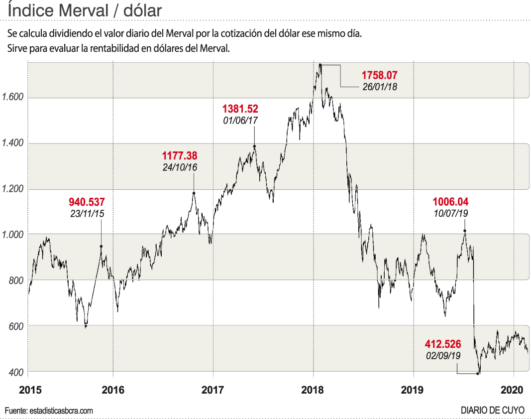 La cotización del dólar es la oficial, la única que usa el Banco Central. Hubo una época en que teníamos un sólo dólar y en aquél caso no había más que un único índice a tener en cuenta. Hoy podría haber varios, según fuera el tipo de cambio que tomáramos, pero si usáramos el más popular, que es el "blue", bajaría a sólo unos 200 puntos. Traducido, nadie apuesta a poner dinero en alguna empresa argentina sea del rubro que fuere.