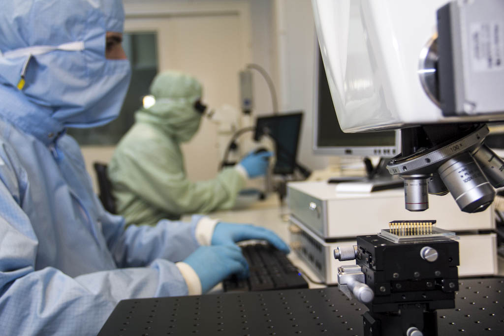 Bajo la lupa. El ingeniero Granell, con el obligatorio traje azul que se utiliza en la “sala limpia”, observa atentamente la conformación del sensor bajo la óptica del microscopio.