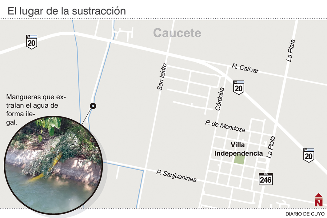 La maniobra delictiva fue descubierta el último martes, en Caucete. Según fuentes judiciales, un rato antes de las 14 personal del Departamento Hidráulica a través de un llamado telefónico alertó a los policías del Comando Radioeléctrico Este, que dirige el comisario Marcelo Pérez. La denuncia indicaba que en una finca situada en calle Patricias Sanjuaninas, en Villa Independencia, estaban sustrayendo ilegalmente agua para regadío de un canal.
