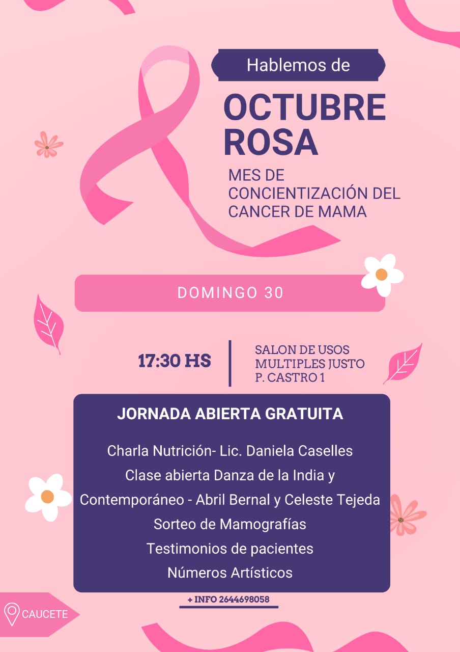 La Escuela de Danzas y Arte "Colores de Oriente" invita a las jornadas "Hablemos de Octubre Rosa", que se llevarán a cabo el sábado 29 y domingo 30 de este mes, con el objetivo de concientizar sobre el cáncer de mama.