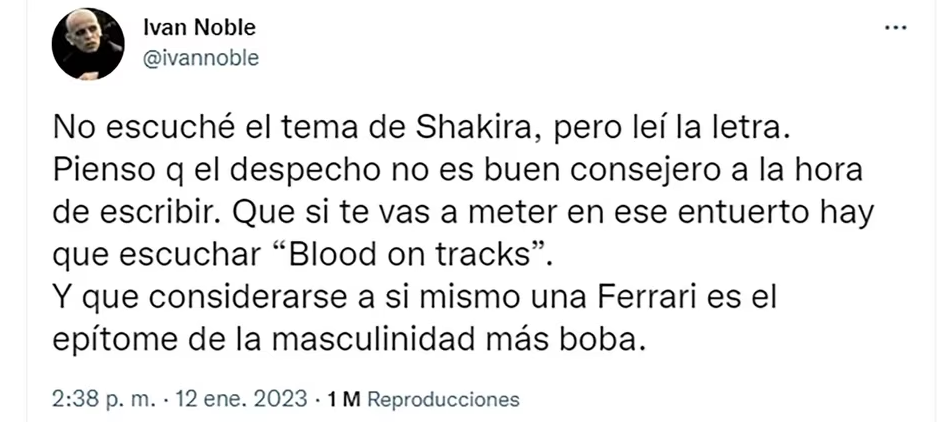 “No escuché el tema de Shakira, pero leí la letra. Pienso que el despecho no es buen consejero a la hora de escribir. Que si te vas a meter en ese entuerto hay que escuchar ‘Bood on tracks’”, escribió el exlíder de Los Caballeros de la Quema en su cuenta de Twitter, haciendo alusión al álbum que Bob Dylan lanzó en el año 1975 y cuyas canciones hablaban de su distanciamiento de quien fuera su esposa de entonces.