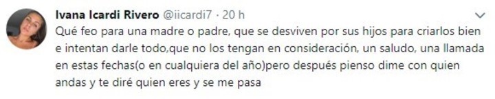 "Qué feo para una madre o padre, que se desviven por sus hijos para criarlos bien e intentan darle todo, que no los tengan en consideración, un saludo, una llamada en estas fechas (o en cualquiera del año) pero después pienso ‘dime con quién andas y te diré quién eres’ y se me pasa", fue el primer y fulminante mensaje que escribió la hermana del futbolista este miércoles.