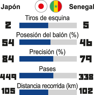 Mané, una de las estrellas del Liverpool inglés y subcampeón de la última Champions League, anotó tras un rebote largo que dejó el arquero Kawashima y fue la mejor opción ofensiva de los africanos, pero pocos minutos después Inui empató para los japoneses. El segundo tiempo fue de ida y vuelta, Senegal volvió a ponerse arriba por intermedio de Wagu, pero una falla grave del otro guardameta, Khadim Ndiaye, volvió a empardar el marcador con un tanto del histórico Honda.