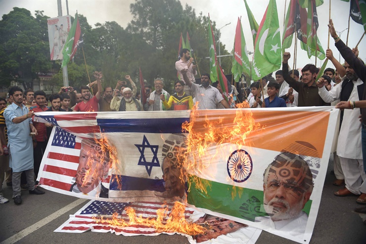 Con banderas palestinas y otras negras, así como con llaves para simbolizar su demanda de poder retornar a las tierras de las que sus antepasados tuvieron que huir o fueron expulsados a raíz de la fundación del Estado de Israel en 1948, varios manifestantes también quemaron una bandera de Estados Unidos.