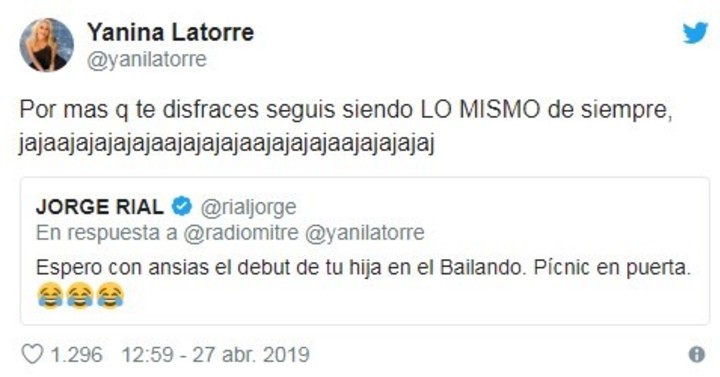 Yanina no tardó mucho en prenderse al juego 2.0 y rápidamente le respondió a Rial en la misma red social: "Por más que te disfraces, seguís siendo lo mismo de siempre, jajajajajajaja".