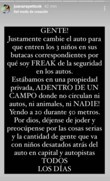 Tras algunas quejas de sus seguidores, la actriz salió a responder: “¡Gente! Justamente cambié el auto para que entren los tres niños en sus butacas correspondientes, porque soy FREAK de la seguridad en los autos”. Estábamos en una propiedad privada ADENTRO DE UN CAMPO donde no circulan ni autos ni animales ¡ni NADIE! Yendo a 20 durante 50 metros”.