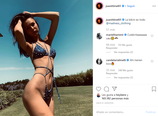 Juanita Tinelli tiene 2 millones y medio de seguidores en Instagram y en esta oportunidad, cientos de ellos le dejaron comentarios halagando su belleza. “QUE BOMBOOON QUE ME ENCONTREEEE; Prendida fuego; Que hermosa eres; Una bomba; Sos tan hermosa; Dios mujerr”, fueron algunos de los mensajes que recibió.