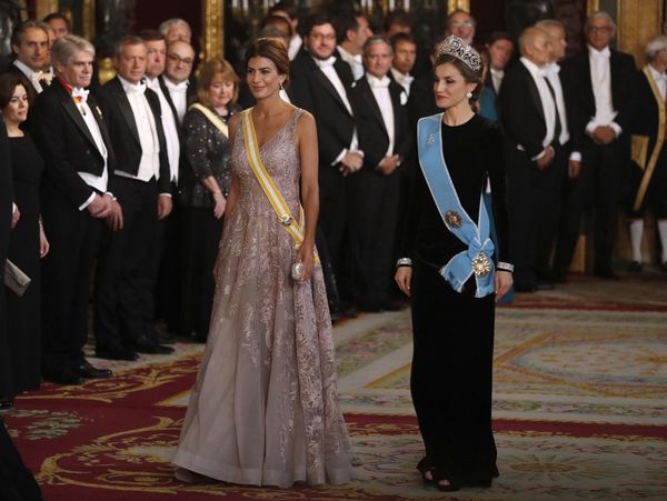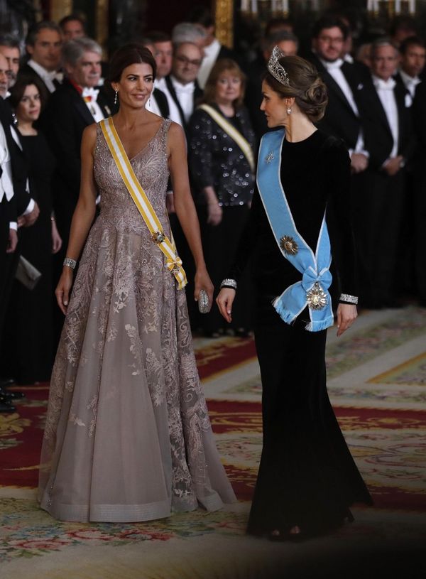 Fue el segundo round de estilo. Únicas, sofisticadas y femeninas, la reina consorte -Letizia Ortiz- y la primera dama –Juliana Awada– se llevaron todas las miradas con sus majestuosos trajes de alta costura. Como es tradición, Don Felipe y doña Letizia oficiaron de anfitriones y recibieron a sus invitados con todo el ceremonial en el fastuoso Salón del Trono en el Palacio Real de Madrid.