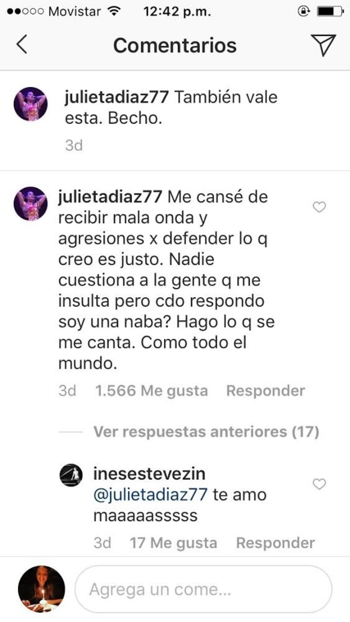 Es más, en uno de los comentarios de la segunda captura de pantalla que la artista compartió, ella misma aclaró los motivos de su comportamiento. “Me cansé de recibir mala onda y agresiones por defender lo que creo que es justo (en clara referencia a la despenalización del aborto)", comenzó diciendo Julieta.