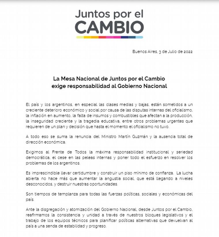 La coalición opositora Juntos por el Cambio (JxC) llamó a la "templanza" de todas las fuerzas "políticas, sociales y económicas" del país, en un comunicado difundido un día después de la renuncia del ministro de Economía, Martín Guzmán.