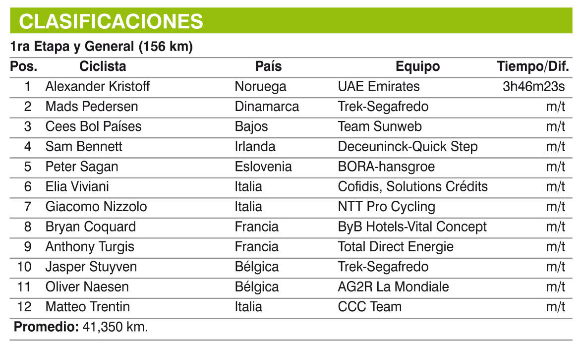 El noruego Alexander Kristoff (UAE Team Emirates) ganó ayer en Niza el embalaje que definió la primera y accidentada etapa del 107º Tour de Francia. Al podio lo completaron el danés campeón del mundo Mads Pedersen (Trek-Segafredo) y la joven bala neerlandesa Cees Bol (Team Sunweb). Fue una jornada complicada por la lluvia, que provocó numerosas caídas. Los comisarios de carrera tomaron los tiempos para la general a tres kilómetros de meta, lo que dejó sin efecto una caída masiva ocurrida en los últimos compases de la etapa que afectó a varios de los favoritos para la victoria final.