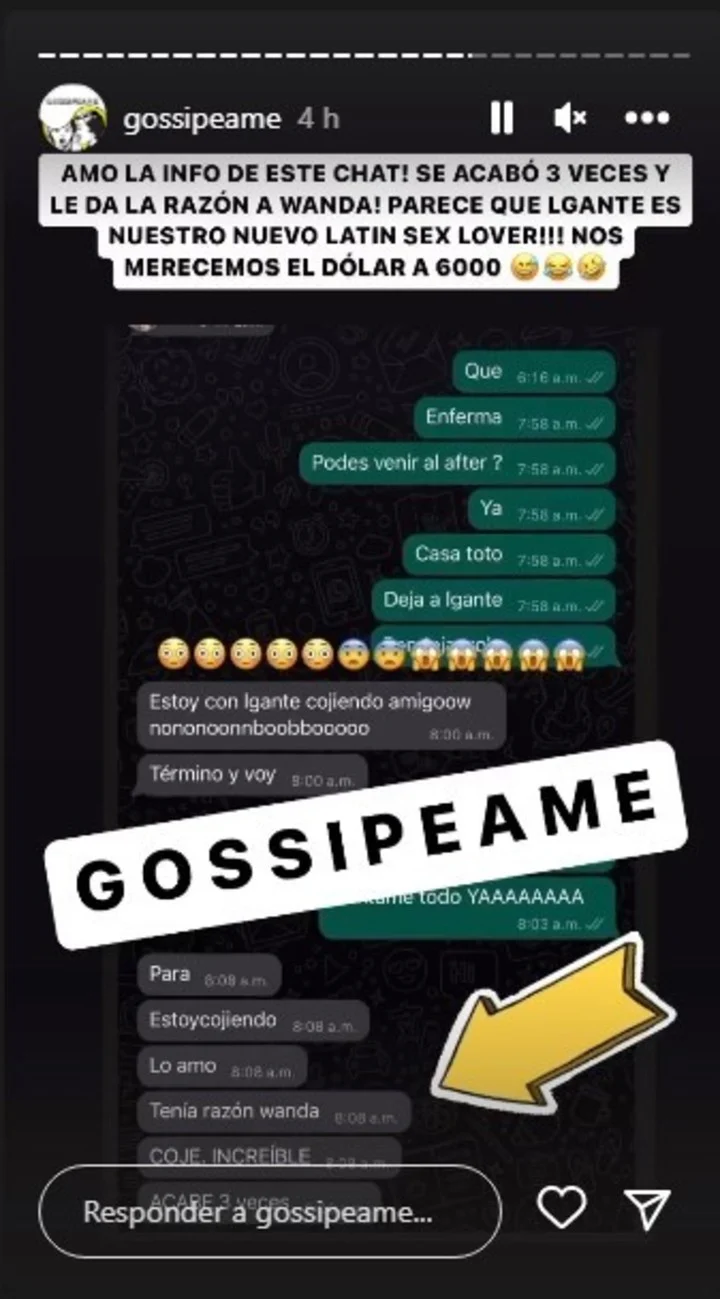 "Amo la info de este chat. Le da la razón a Wanda. Parece que L-Gante es nuestro nuevo latin sex lover", agregó la dueña de @gossipeame en una historia en la que mostró una captura de chat en la que Anto aseguraba estar manteniendo relaciones sexuales con el músico.