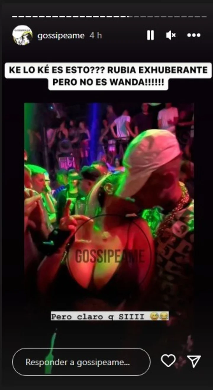 Ya en una segunda imagen, en la que ellos están a los besos, la administradora de la mencionada cuenta agregó: "¿Ke lo ké es esto? Rubia exuberante, pero no es Wanda".