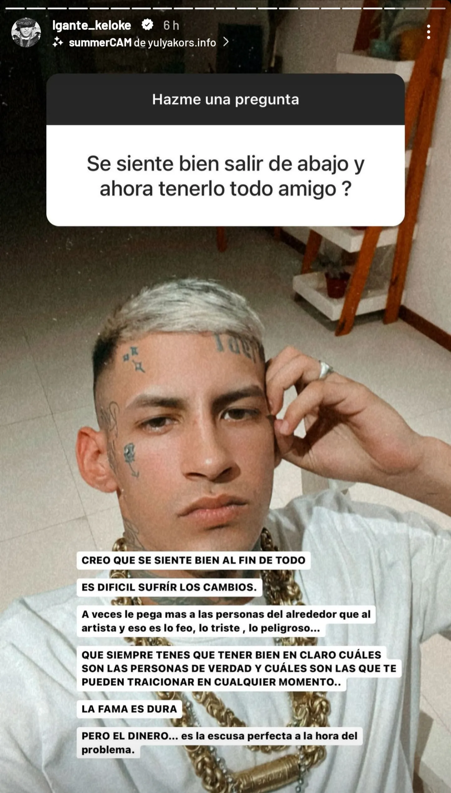 Desde que L-Gante ganó mayor reconocimiento por sus canciones, su vida cambió totalmente y se empezó a involucrar en diferentes conflictos tanto personales como mediáticos. El cantante es consciente de eso y remarcó que “es difícil sufrir los cambios”. Sin embargo, para él, “el dinero es la excusa perfecta a la hora del problema”.