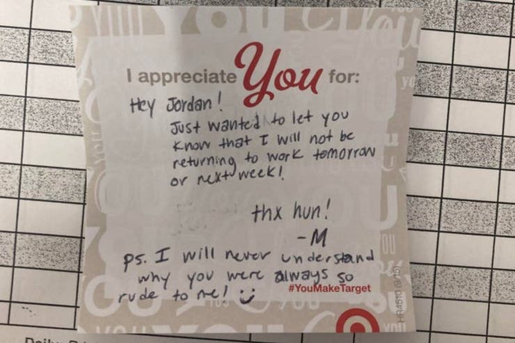 Una mujer de Estados Unidos, empleada de la cadena de supermercados Target, decidió renunciar a su trabajo de una manera particular: le dejó a su jefe una breve nota donde le avisaba que "no volvería" asu puesto y le agregó una posdata en la que dejaba asentada una queja contra su patrón, por la manera en que la había tratado.