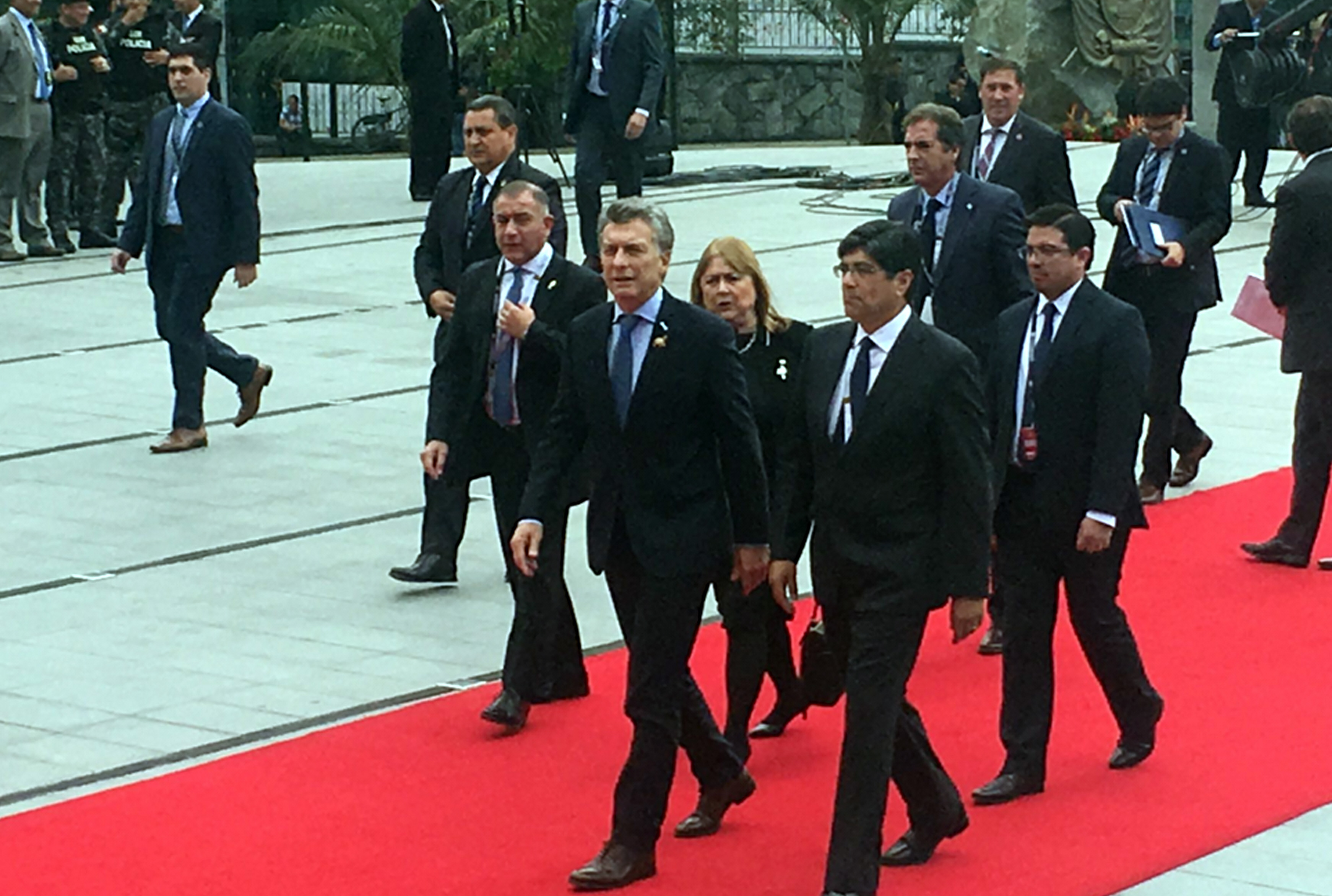 Al arribar a Ecuador, junto a la canciller Susana Malcorra y su vocero Iván Pavlosvky, el mandatario se declaró ‘feliz de estar acá después de mucho tiempo, para celebrar juntos un día en la democracia‘.