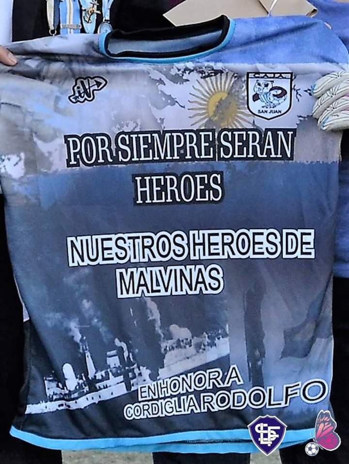 “Por siempre serán héroes” y “Nuestros héroes de Malvinas”, son las leyendas de la camiseta, en la que se ve además el Ara General Belgrano. Debajo, aparece el nombre del veterano sanjuanino.