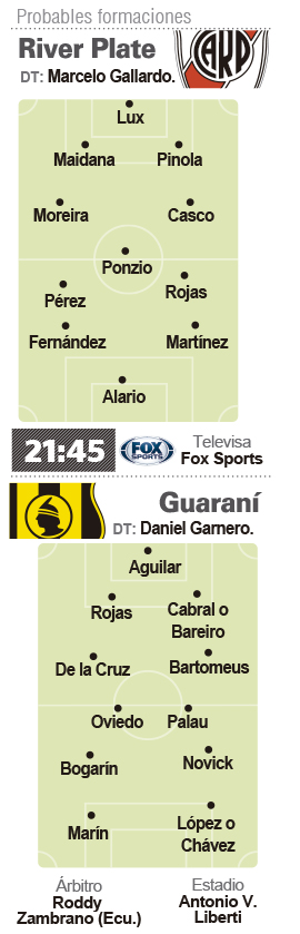 River, con los debuts del mediocampista Enzo Pérez y el arquero Germán Lux, dos de los cinco refuerzos que incorporó el club, buscará en la jornada de hoy sellar su clasificación a los cuartos de final de la Copa Libertadores de América de fútbol cuando reciba a Guaraní de Paraguay, adversario al que venció por 2-0 en el partido de ida jugado en Asunción.