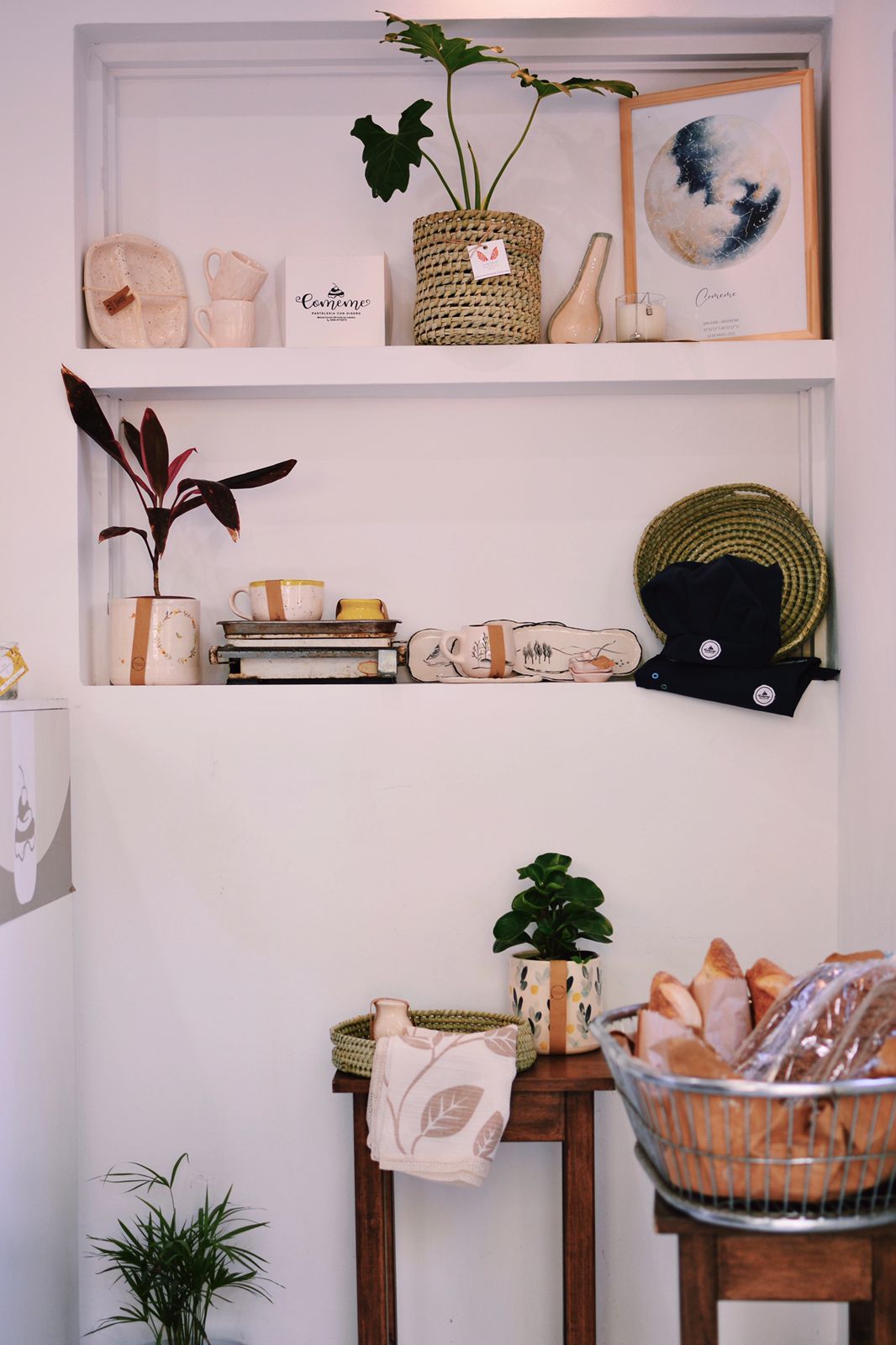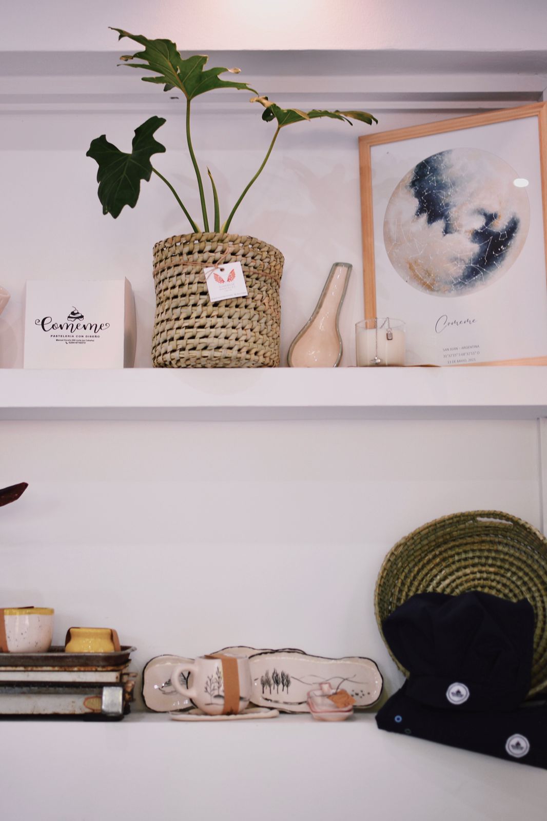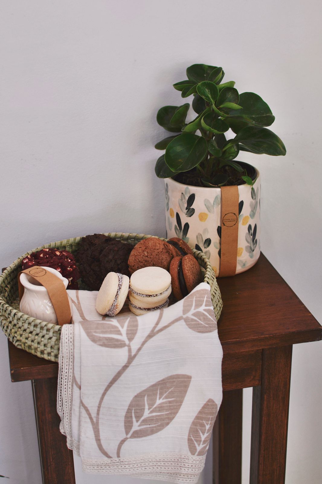 Por eso es que en el lugar además vender Cheescake, Tiramisú, el box matero (con brownie, alfajores de maicena, cookies con chips de chocolate y alfajores de choco Nutella), Lemon Pie, galletitas de sabores varios, Tarta Toffee, Crumble de manzanas, Rogel y macarons, entre otras dulzuras, hay velas aromatizadas (de las emprendedoras Dos hermanas), vajilla de Imaginaria Cerámica y de Rompe Paga Cerámica, que además hace piezas únicas como porta macetas y otros objetos de decoración. Entre los estantes hay para elegir mantelería, individuales y elementos textiles de cocina como gorros y hasta delantales o bandejas (de Almacén de manteles). Pero aparte, una caja de galletas o una tarta puede complementarse a la perfección de un ramo de flores (de Alo Chiqui Baumann) o una planta de Raíz Paisajismo.