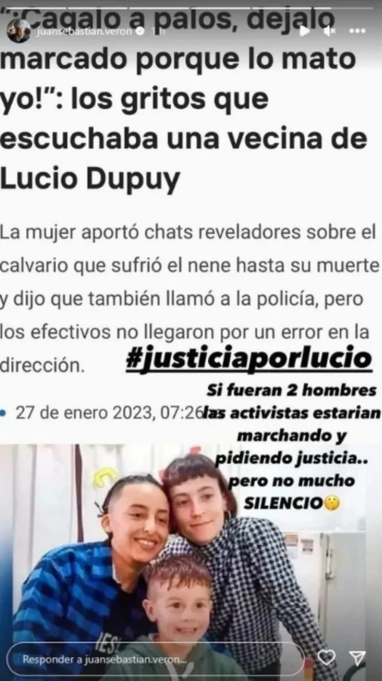 En el fondo de la imagen se puede ver una nota que refleja los dichos de una vecina que estuvo cerca en las últimas horas de Lucio con vida. En ese marco, Verón pidió “#JusticiaPorLucio”.