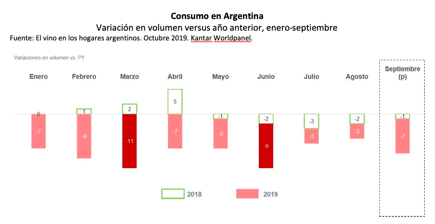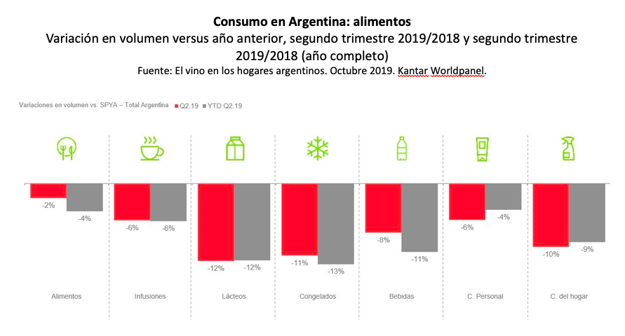 Tomando otros datos de consumo, según un relevamiento de hogares argentinos realizado en octubre de 2019 por Kantar para el Fondo Vitivinícola, unidad ejecutora de la Corporación Vitivinícola Argentina (Coviar) a cargo de la promoción genérica del vino en el mercado interno, este año un total de 9,4 millones de hogares compraron vino en los últimos 12 meses, lo que marca un crecimiento de 1,5 puntos porcentuales en relación a igual período de 2018. Esto significa que en 2019 se recuperaron unos 200.000 hogares que volvieron a consumir vino en relación a los números del año pasado, explica Joaquín Oría, investigador de Kantar y responsable del informe.