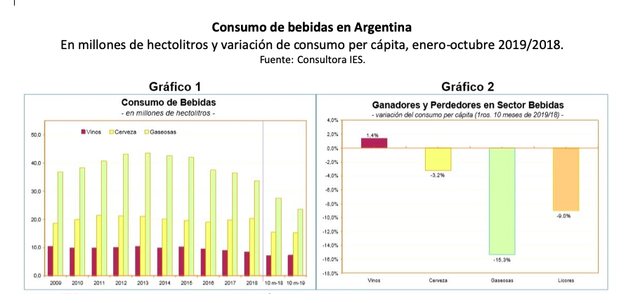 Según datos de la consultora IES, el vino es la única bebida que logra un crecimiento a nivel doméstico en 2019. Con los diez primeros meses de 2019 relevados, el vino crece 1,4% en el consumo interno frente a caídas de bebidas como la cerveza, gaseosas y licores.