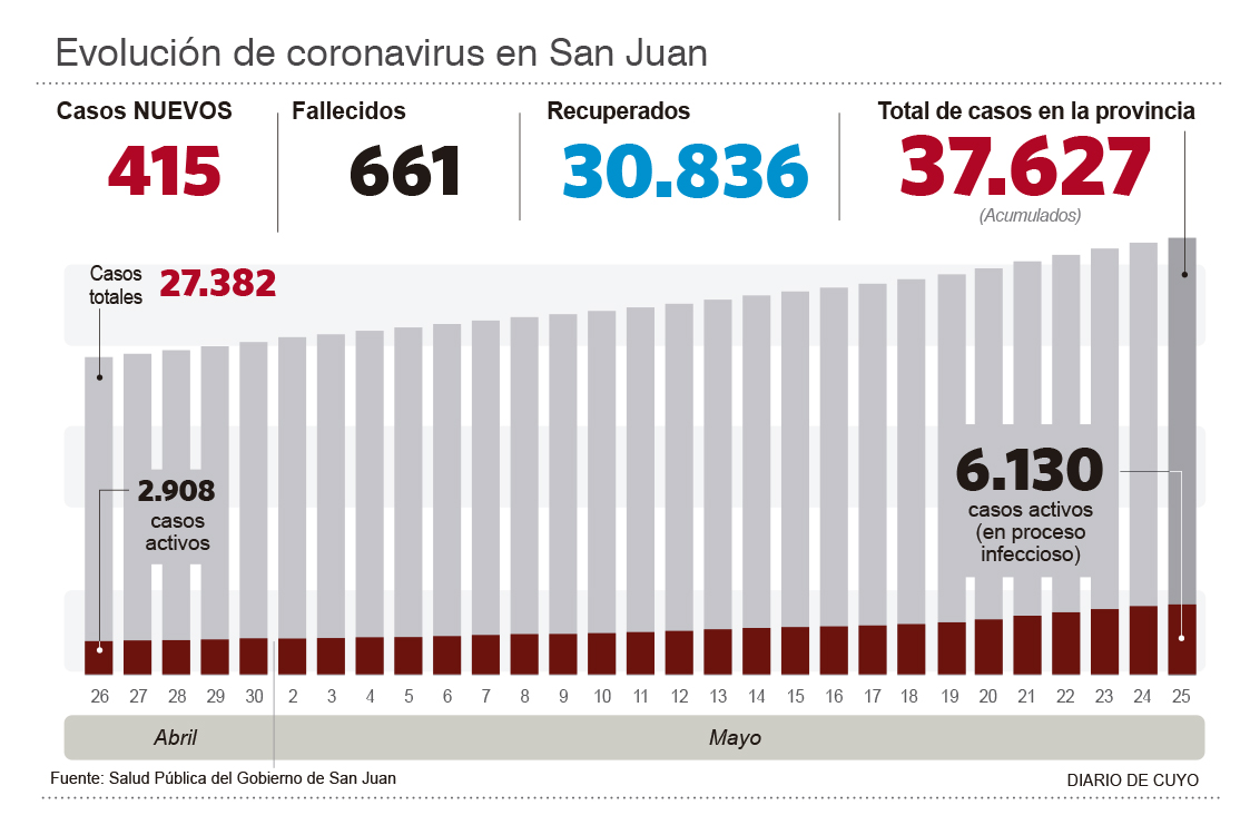 Los fallecidos reportados ayer eran tres hombres de 64; 77 y 87 años; y una mujer de 661, en tanto que los decesos totalizan 661. Con los 415 casos de ayer, por su parte, el acumulado es de 37.627 infectados.