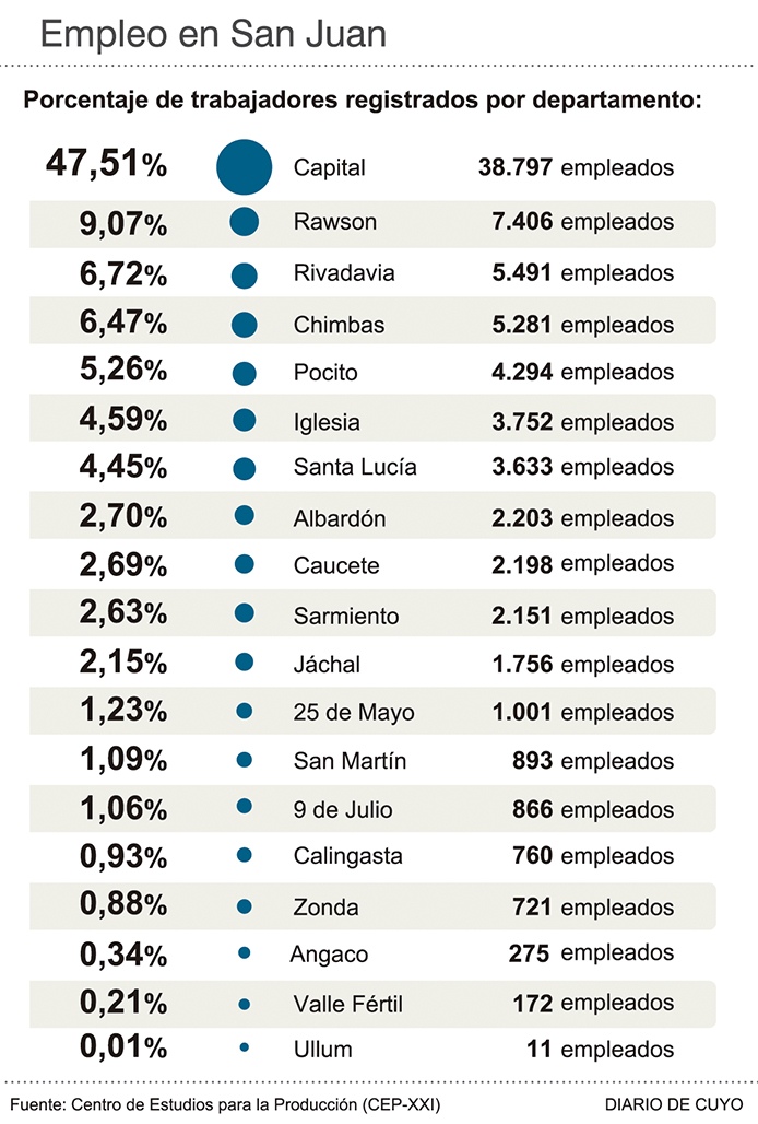 Entre los departamentos que concentran la mayor cantidad de población laboral siguen, después de Capital y Rawson (ver infografía), Rivadavia con 5.491 empleados (6,72%), Chimbas con 5.281 (6,47%) y Pocito con 4.294 (5,26%). En la otra punta de la tabla se ubica Ullum, con apenas 11 empleados.