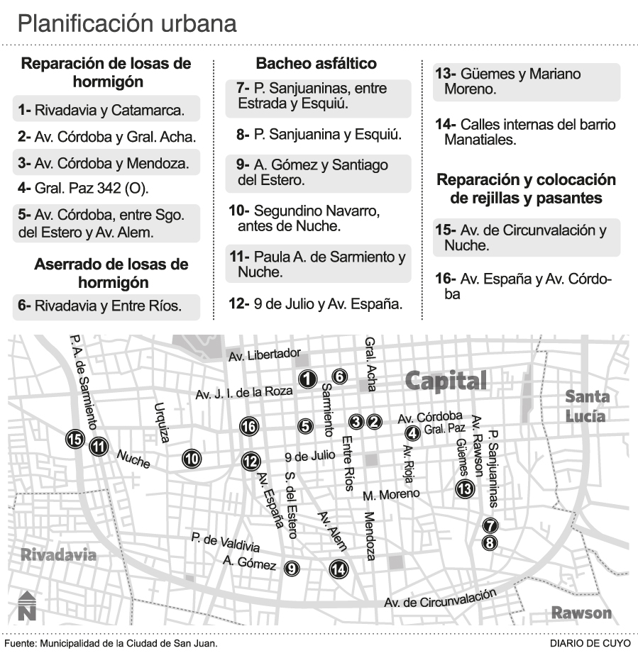 El secretario de Planificación Urbana, Federico Noguera, señaló que la intención es que todas las calles estén en óptimas condiciones para transitarlas, por eso es que las tareas se realizan más allá del microcentro. Es decir que se trabaja desde 25 de Mayo hasta calle Brasil y desde Las Heras hasta Rawson, pero el plan comprende toda la ciudad. Es que la mayoría de las calles de nuestra capital fueron construidas en placas de hormigón armado. Se trata de un pavimento muy resistente que de muchos años de duración, pero las alteraciones del subsuelo produjo grietas. Afuera de esta superficie mencionada, se puede decir que la avenida Libertador en toda su extensión, como la avenida Ignacio de la Roza hasta Paula Albarracín de Sarmiento, también fueron construidas con placas de hormigón armado. Mientras que hay otras calles que fueron hechas con concreto asfáltico que es otro método de pavimentación.