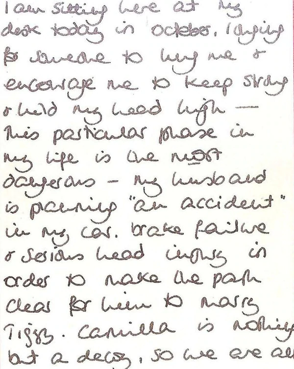 "Esta fase particular de mi vida es la más peligrosa: mi esposo está planeando ‘un accidente’ en mi automóvil, fallas en los frenos y una lesión grave en la cabeza a fin de dejar el camino libre para que se case con Tiggy (Camilla Parker Bowles)", dice una extracto de la carta. "Camilla no es más que un señuelo, así que todos estamos siendo utilizados por él en todo el sentido de la palabra".