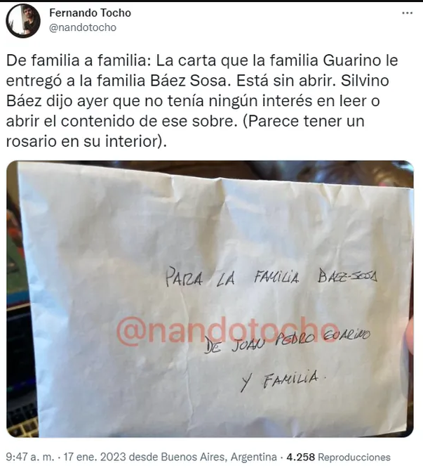 “En la carta Guarino le da las condolencias a la familia Báez Sosa, el escrito fue dejado en una papel madera y con un rosario”, informó Tocho.