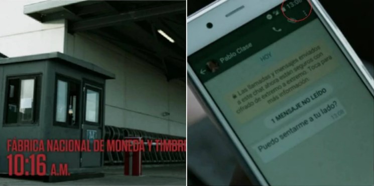 Momentos antes del atraco, vemos llegar en autobús a un grupo de estudiantes que planea visitar ese día el edificio. Antes de bajarse del vehículo escolar, una de las alumnas, Alison, recibe un mensaje en su celular. El teléfono marca las 13:08 horas. Se supone que esta acción ocurre a la vez que el inicio del atraco, que comienza sobre las 10:16 horas. Un fallo en el que no se percataron los editores de la serie.