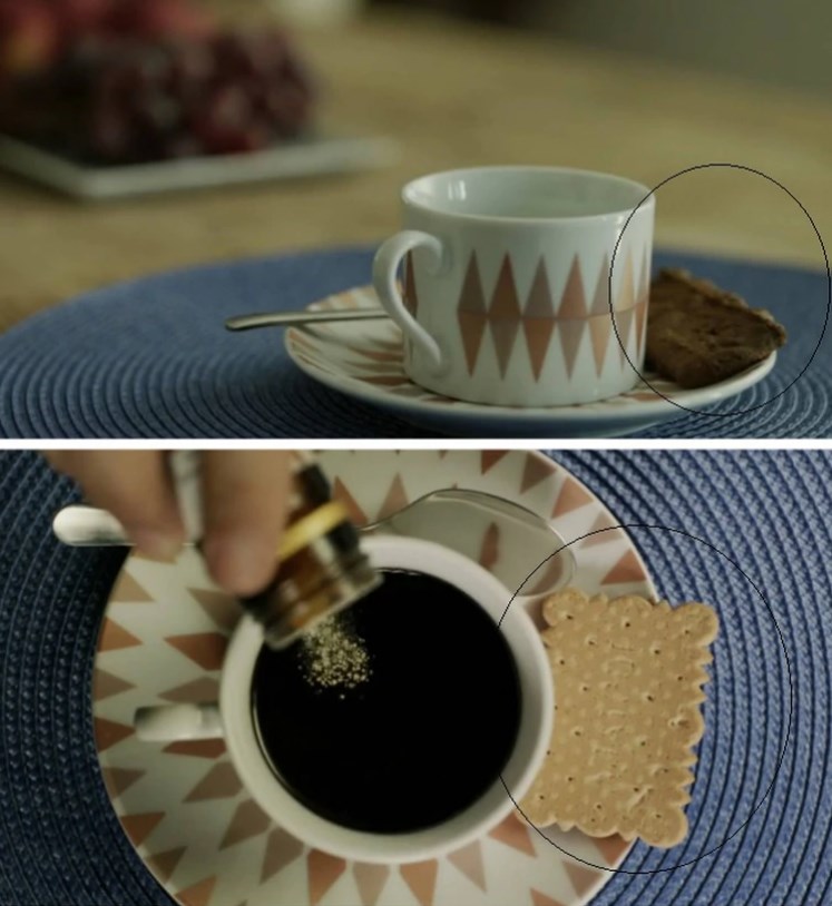 Otro de los errores de raccord llegó cuando El Profesor visitó a la madre de Raquel Murillo, la negociadora del Centro Nacional de Inteligencia. La mujer se sirve una taza de café y una galleta, que cambia de color inexplicablemente de un plano a otro.