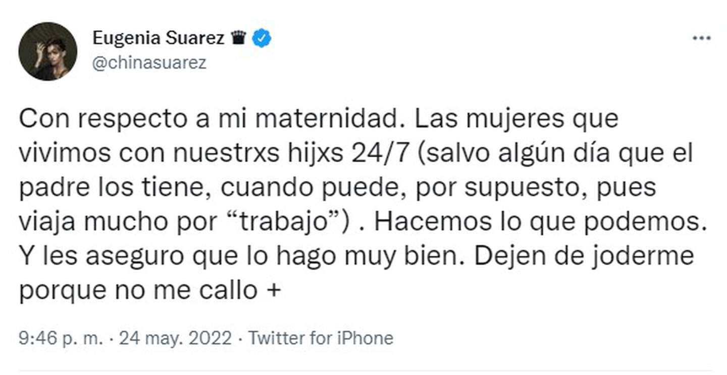 “Con respecto a mi maternidad. Las mujeres que vivimos con nuestrxs hijxs 24/7 (salvo algún día que el padre los tiene, cuando puede, por supuesto, pues viaja mucho por “trabajo”) hacemos lo que podemos. Y les aseguro que lo hago muy bien. Dejen de joderme porque no me callo más”, lanzó picante, cada vez con menos paciencia.