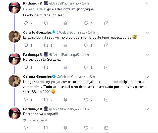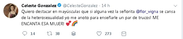 "Quiero destacar en mayúsculas que si alguna vez la señorita @flor_vigna se cansa de la heterosexualidad yo me anoto para enseñarle un par de trucos! ME ENCANTA ESA MUJER! ", escribió Celeste.