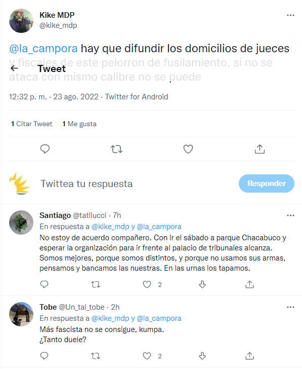 La alarma dentro de la Corte Suprema surgió a partir de un mensaje en Twitter del usuario @kike_MPD en el cual instaba a los manifestantes kirchneristas a indagar sobre los domicilios de los jueces y fiscales para ejercer presión en la causa. “Hay que difundir los domicilios de estos jueces y fiscales de este pelorron [sic] de fusilamiento, si no se ataca con el mismo calibre no se puede”, expresó el tuitero.