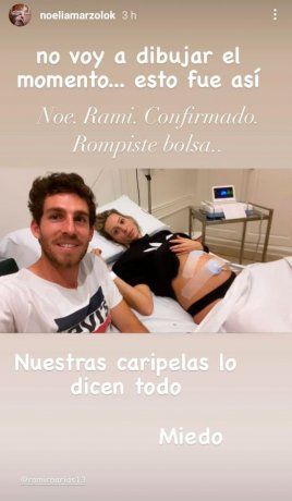 "No voy a dibujar el momento. Esto fue así. Noe, Rami, confirmado, rompiste bolsa. Nuestras caripelas lo dicen todo. Miedo", comenzó junto a una foto de ella en la camilla.