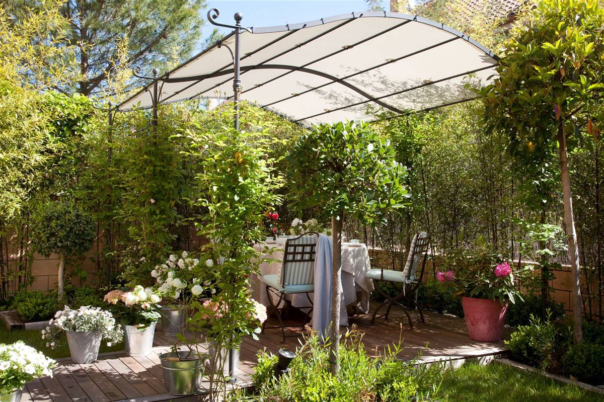 Otro tipo de elemento para cubrirse del sol y muy utilizada en jardín y terraza es la cubierta de estructura metálica con toldo de lona. Asegúrate que esta sea impermeable, repelente a la suciedad y resistente a los rayos UV y al granizo.