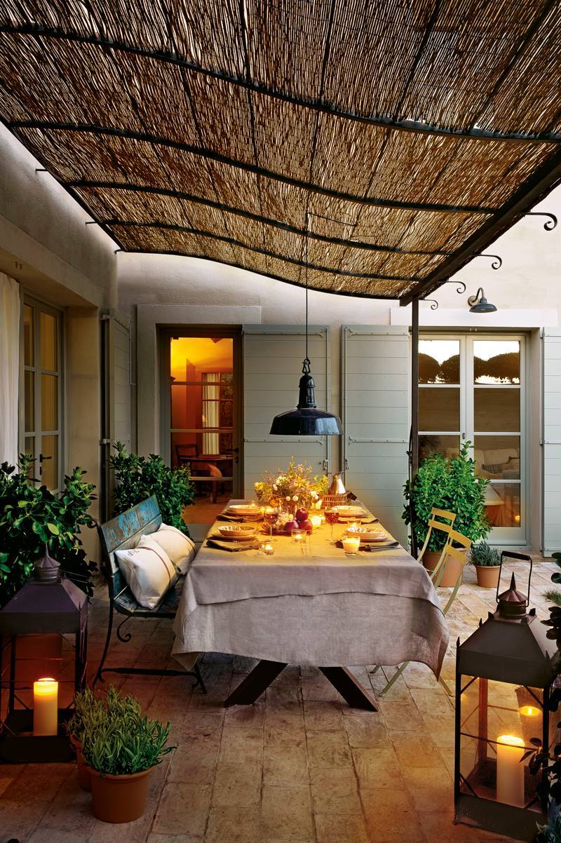 Fíjate es de hierro galvanizado pintado, pero aquí se ha cubierto de cañizo. Durante el día, a través de sus ramas se filtran con naturalidad los rayos de sol. Incluso al atardecer será un gustazo sentarse en este comedor y prolongar la velada hasta altas horas de la noche. ¡Imprescindible decorar con farolillos!