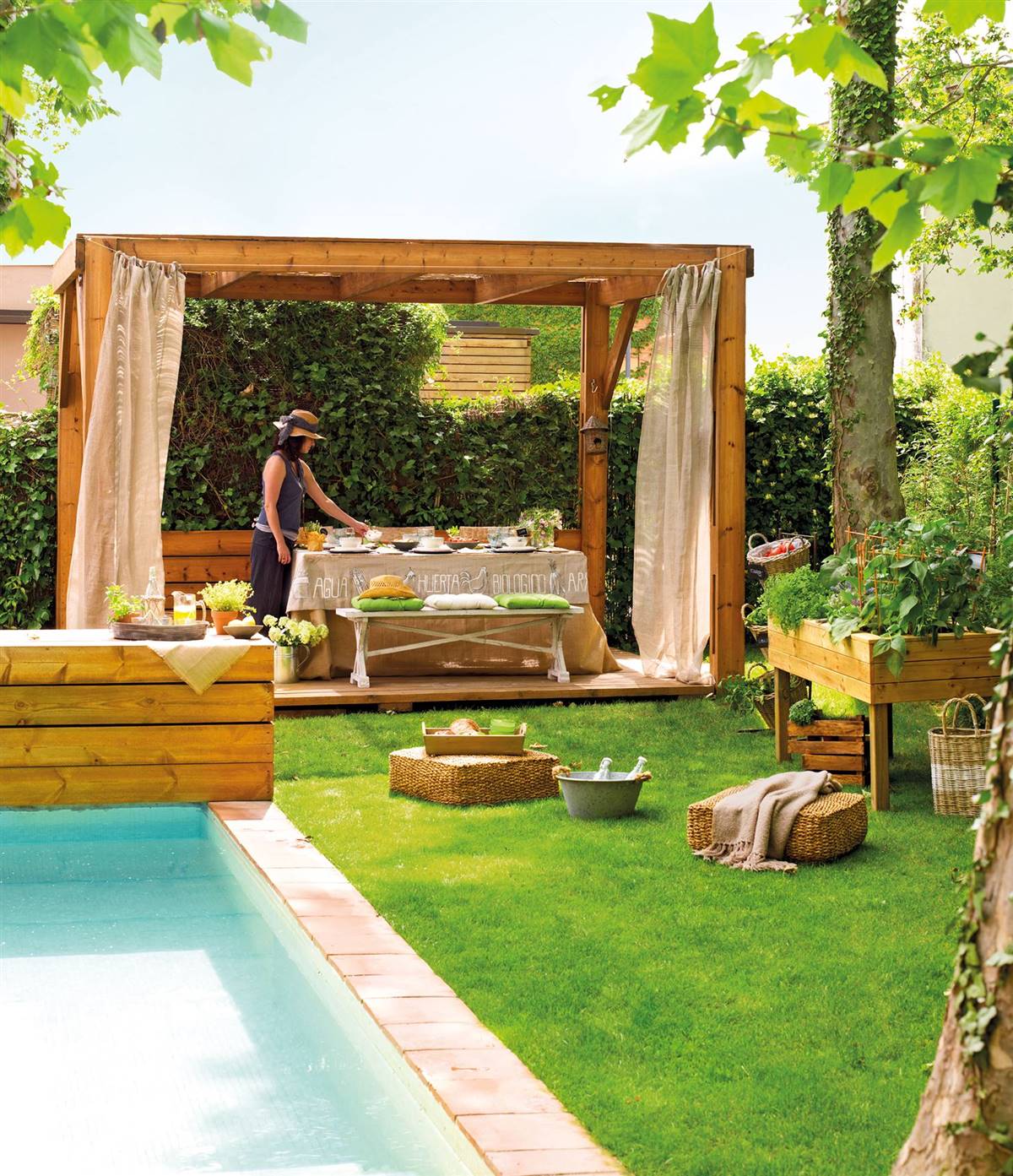 ¿Quieres crear un cenador al aire libre o una zona chill out en tu jardín? Las pérgolas independientes te lo permiten, como esta de madera con cortinas, ideales para preservar la intimidad ¿A que parece una casita sin puertas? Si la colocas cerca de la piscina, tendrás frescor garantizado.