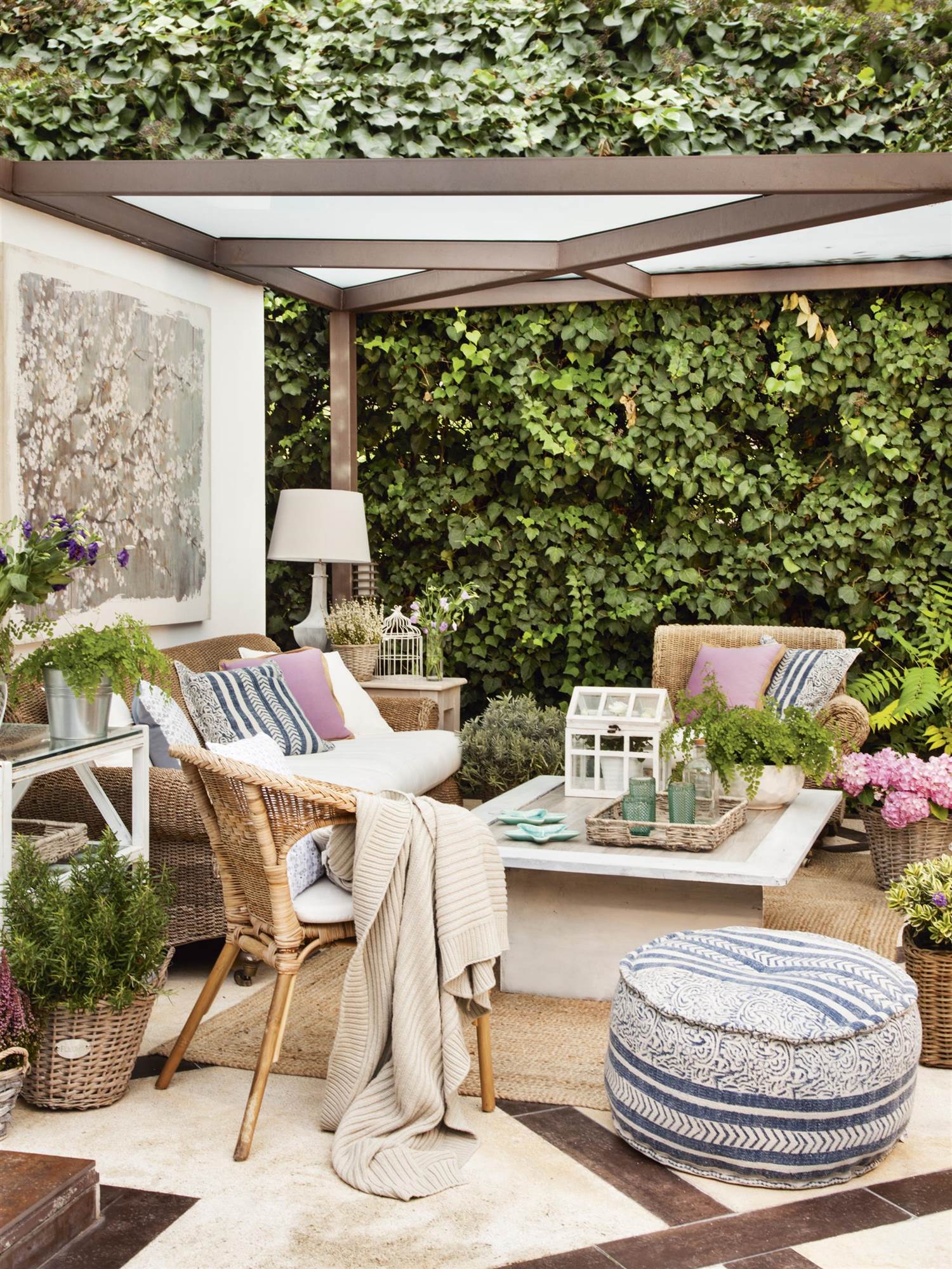 Si en tu patio has decidido crear un salón al aire libre con un sofá de obra y unas butacas, disfruta del exterior instalando una pérgola para jardín de madera envuelta en enredaderas con flor. Estas, además de decorar con sus vivos colores, perfumarán el ambiente con sus deliciosos aromas. Toma buena nota de las trepadoras más comunes: jazmín, madreselva, clemátide, pasiflora, glicinia o buganvilla, como las de la imagen.