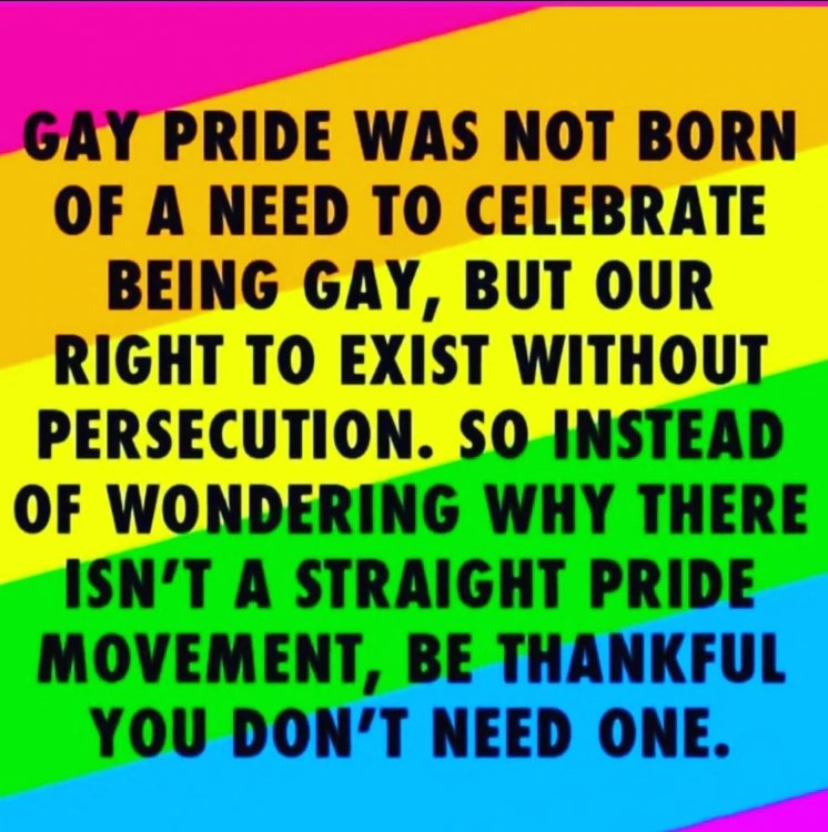 "El orgullo gay no nació de la necesidad de celebrar el hecho de ser gay, sino de nuestro derecho a existir libres de persecución/discriminación. Así que, en lugar de preguntarte por qué no hay un movimiento de orgullo heterosexual, agradece que no necesitas uno".