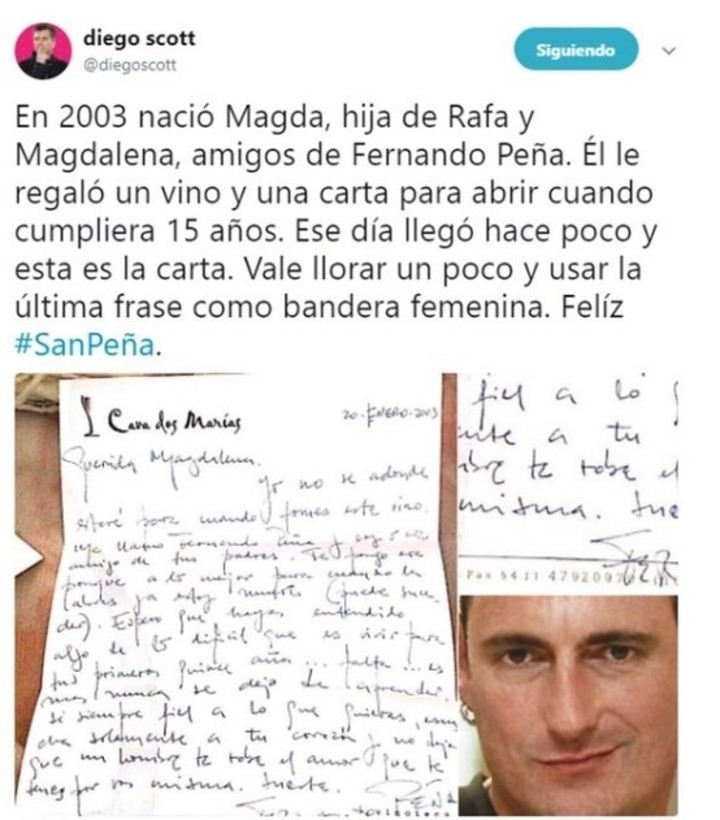 “En 2003 nació Magda, hija de Rafa y Magdalena, amigos de Fernando Peña. Él le regaló un vino y una carta para abrir cuando cumpliera 15 años. Ese día llegó hace poco y ésta es la carta. Vale llorar un poco y usar la última frase como bandera femenina. Feliz #SanPeña”, escribió Scott junto al posteo y una imagen del humorista fallecido.