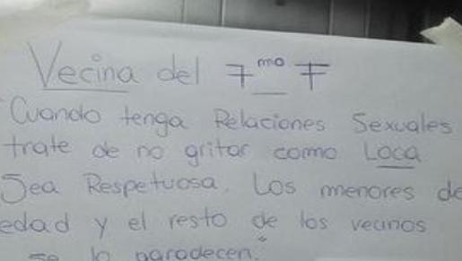 Algo así le ocurrió a un usuario de Twitter, quien sacó una foto del mensaje poco amistoso que le dejaron a la vecina del 7° F por sus ruidos sexuales para que “trate de no gritar como una loca”.