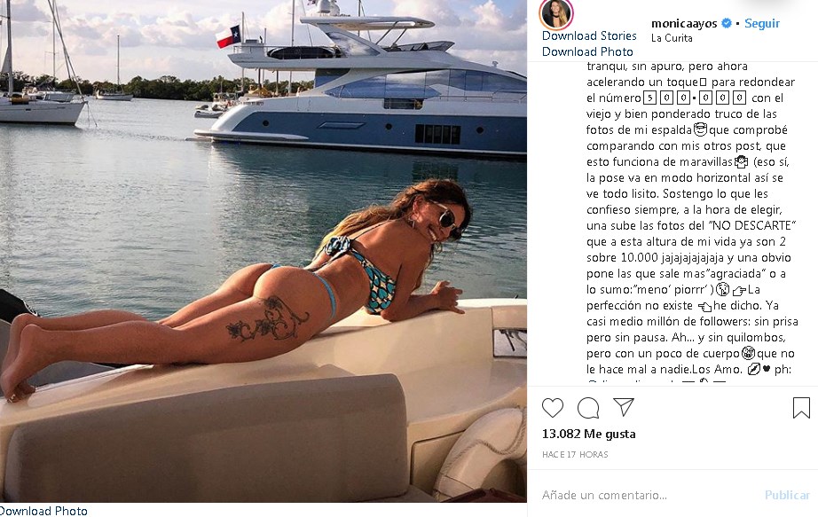 Unas horas antes, la actriz quiso subir la apuesta con una fotografía en la que se la ve de espaldas en el borde de un yate y en la publicación confiesa cuál es su intención. Ayos quiere llegar al medio millón de seguidores y como sabe que esa postura le favorece, se anima y postea.