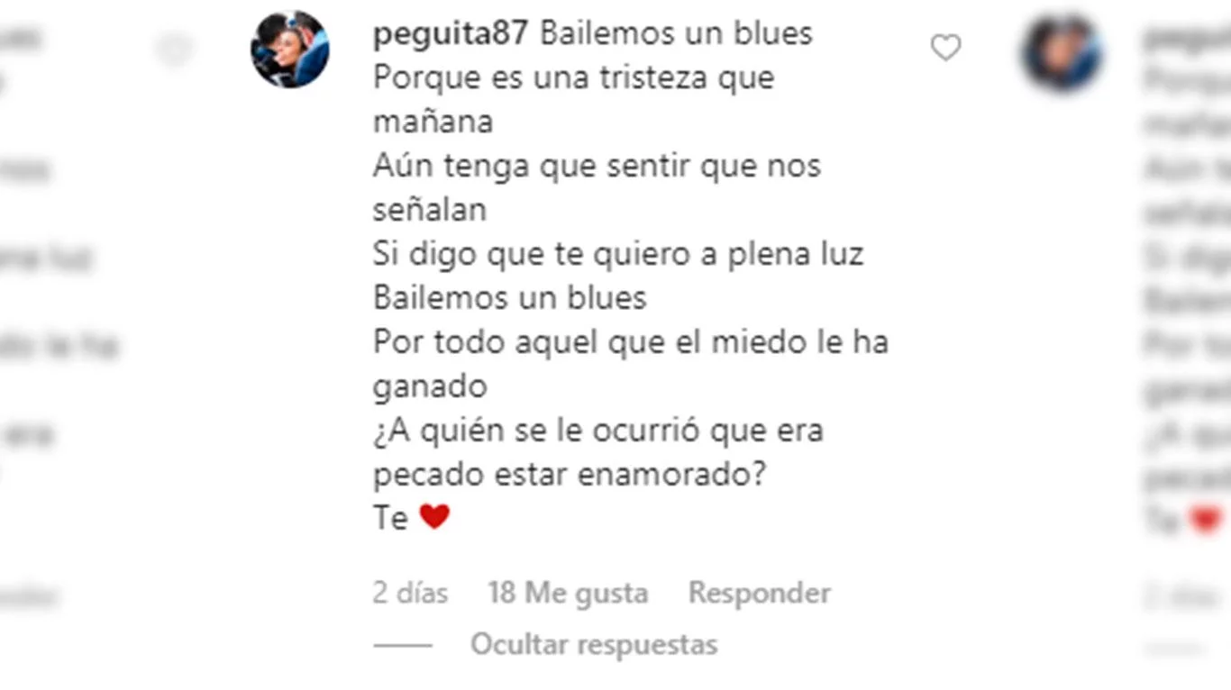Montiel no tardó en responder al mensaje y contestó: "¿A quién se le ocurrió que era pecado estar enamorado?". Y luego agregó un contundente: "Te amo", junto a un corazón.